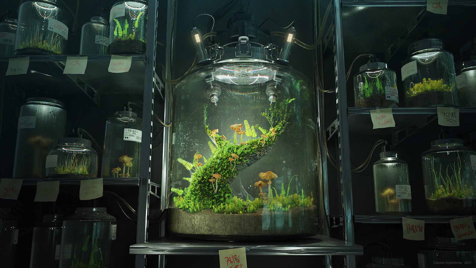 So for this render, I wanted to bring the viewer into a lab of multiple micro biomes contained in bottles. Each bottle being fed by a network of water lines and wires to power the UV lights. Each individual world is carefully monitored and documented to ensure that they flourish within their bottle.